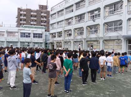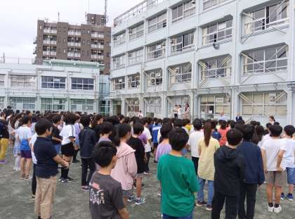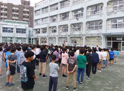 児童朝会を行いました。生活指導の教員から、梅雨入りが迫り、雨の日が多くなるので室内での安全な過ごし方や廊下歩行の徹底について話をしました。