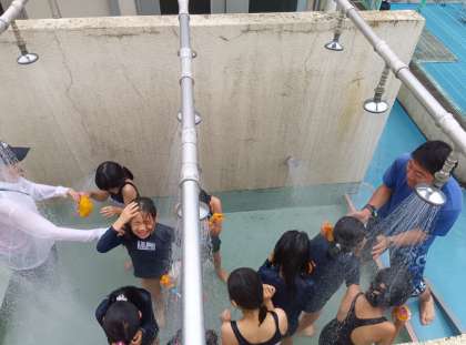 1年生がプールに入りました。気温は少し低めでしたが、水温が温かく、入ることができました。そして初めての「地獄のシャワー」を経験しました。プールの水とは違い冷たい水を頭空っぽかぶり、悲鳴が上がりました。何とか我慢してシャワーを浴び、プールでの活動を楽しむことができました。