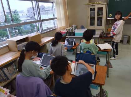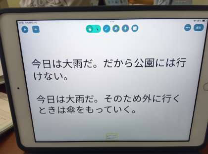 4年生の国語では「つなぎ言葉」の学習をしています。だから、そのため、したがって、しかし、など多様なつなぎ言葉を使い分け、タブレット端末を使って文作りを楽しみました。
