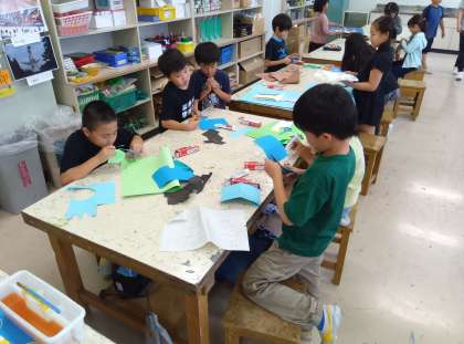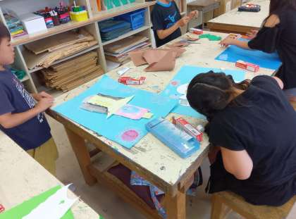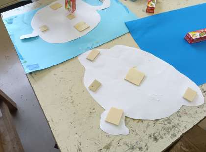 4年生の図工は「ふしぎなのりもの」です。あったらいいな、こんな乗り物があったらおもしろいな、など子どもたちの豊かな感性や発想力を生かして作品作りを進めています。描いた乗り物の裏にチップを貼ることで背景から浮き出たような立体感を出して一つの作品に仕上げていきます。三学期の展覧会で展示する予定です。