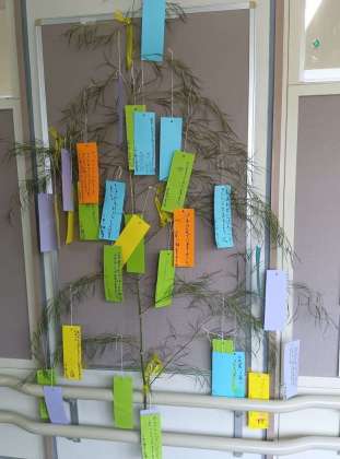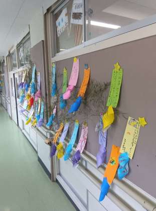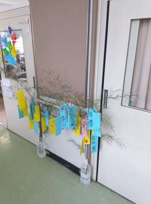 校舎2階の1〜3年生の教室前の廊下には願い事を書いた短冊を掛けた笹が並んでいます。地域の方のご協力で七夕の願い事を飾ることができました。「ぱてぃしえになれますように」「いつかアメリカにいけますように」「せんそうがなくなりますように」など、それぞれの個性あふれる願い事が見られました。みんなの願い事が叶いますように。