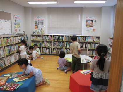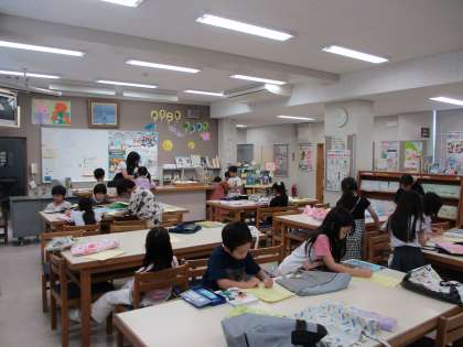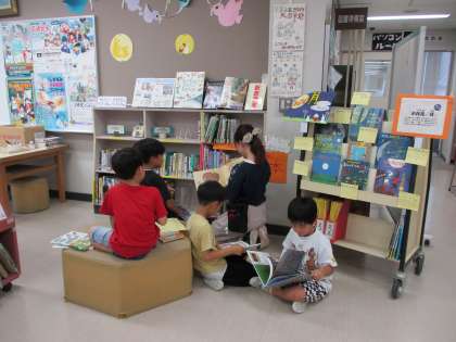 4時間目の図書の時間、図書室で、思い思いに読みたい本をえらんでいる子どもたちの様子です。
