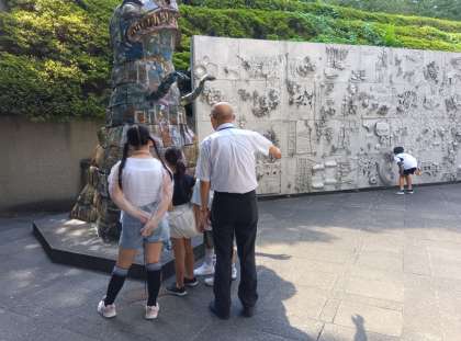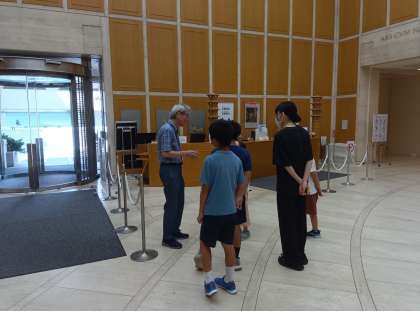 彫刻作品が何の材料でどのように作られたのか、作者がどのような思いを込めて作ったのか等、一つ一つの作品の解説を聞き、子どもたちも興味津々な様子です。