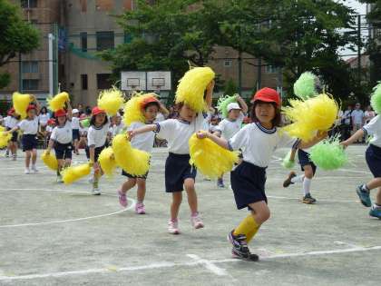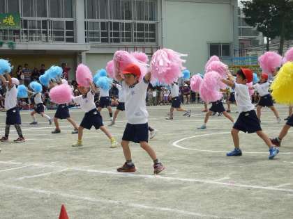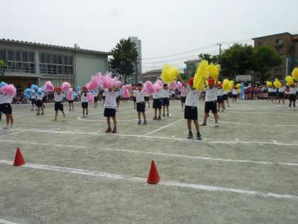 65名の1年生はカラフルなポンポンを使って、かわいらしく元気いっぱいに踊りました。赤白別に並んだり輪になったりと隊型移動も頑張りました。