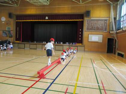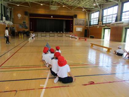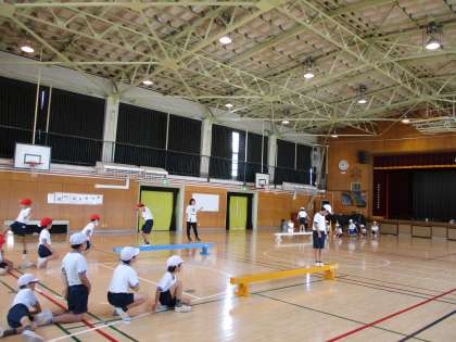 2年生の体育は、マット・平均台遊びの時間でした。平均台を前向きに、うしろ向きにわたっている子どもたちの様子です。
