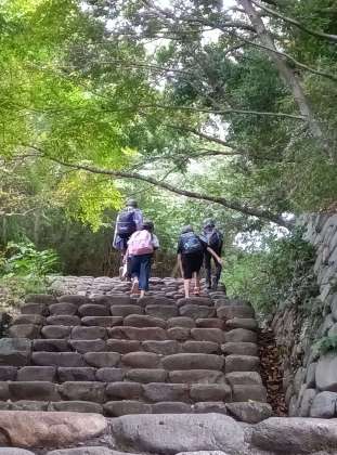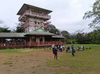 アップダウンの激しい緑地内を元気に歩き、チェックポイントを回っています。桝形山展望台のところでは長縄チャレンジをします。