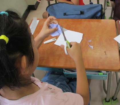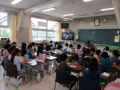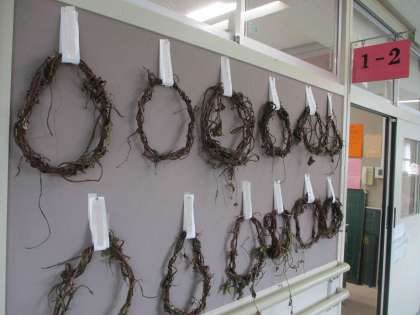 1年生の廊下には、さつまいものつるで作った「リース」が飾ってあります。先週、つるきりにご協力いただいた保護者のみなさま、暑い中ありがとうございました。