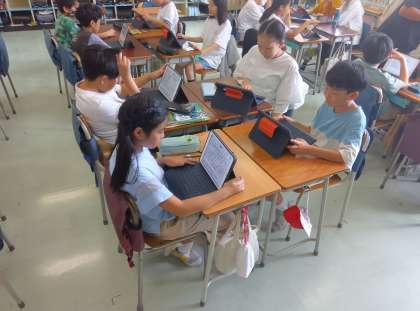 5年3組の社会では、日本の食料生産のこれからについて各自が調べ、スライドにまとめてみんなに発表する活動を行いました。食料自給率を上げるための取組や、労働力確保のための取組、スマート農業など新たな農業のスタイルなど、よく調べ、まとめ、伝えることができました。調べて、情報を選択したり、補足をしたりなど、みんなに伝えることを意識したまとめ方や発表の仕方ができていました。