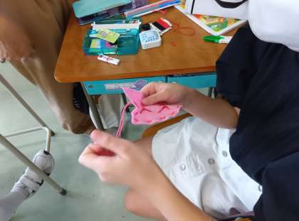 5年生の家庭科では、手縫いの学習を進めています。思い思いの形に型どった布を縫い合わせ、模様を付け、オリジナルの小物を完成させます。針と糸を使ってみんな丁寧に裁縫をしていました。かがり縫いなどに挑戦し、慣れない経験に戸惑いながらも、頑張って作った作品に、みんな満足している様子でした。これら一つ一つを花びらに見立てた作品を3学期の展覧会に展示します。