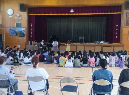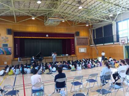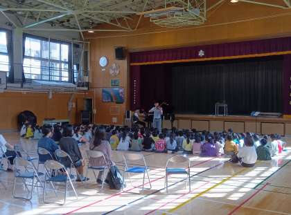 全国の小学校を周り、音楽教室を行っている音楽家のエバリーさんが、本校の1.2年生を対象に音楽教室を開きました。クラシックからポピュラーな曲まで幅広い演奏で子どもたちを楽しませてくれました。心から演奏を楽しむお二人の姿からも、音楽への興味を広げることができました。