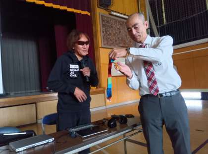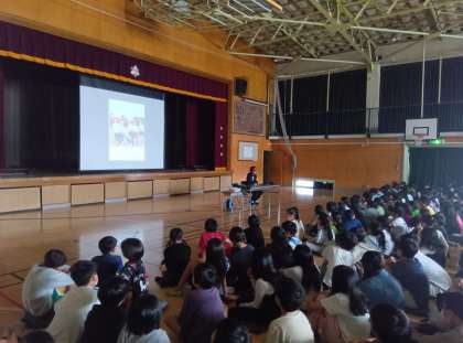 学校公開の初日です。今日は道徳授業地区公開講座を行いました。アテネパラリンピックのマラソン競技視覚障害の部で金メダルを獲得した高橋勇市さんをお招きし、4〜6年生の児童に講演をしていただきました。テーマは「夢をあきらめない」です。高橋さん自身の経験をスライドと共にお話いただきました。高橋さんの小学校6年生の時の夢はオリンピックで金メダルをとることでした。その後、高校生の時に目の病気が判明し、生きることすら諦めかけたこともあったとのこと。しかし、アトランタパラリンピックの報道を耳にし、パラリンピックという存在を知りました。そこから生きる力を取り戻し、アテネでの金メダルにつなげました。夢をあきらめないことの大切さを子どもたちは教わりました。金メダルに触らせてもらうこともでき、大喜びでした。