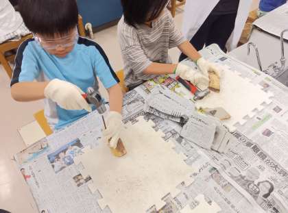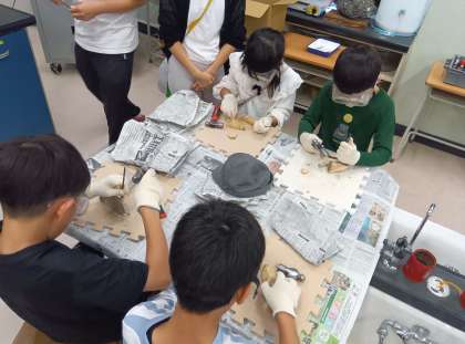 東京都市大学の先生をお招きし、「葉っぱ化石の割り出し」体験を行いました。対象は3年生でした。地層のしくみを教わり、これまでに発見された化石などを知りました。一人一人に湖の湖底から採取した岩石のブロックが渡されました。化石の割り出し方を学び、割り出し体験を始めました。「ワクワクする!」「楽しみ!」と大喜びです。地学博士、考古学博士になりきって、意欲的に取り組みました。