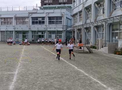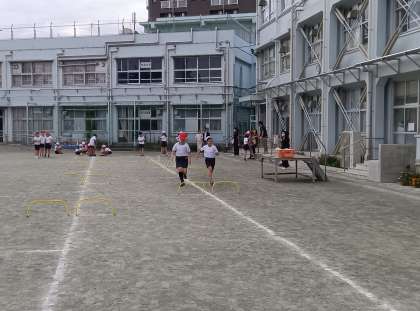 4年生の校庭体育は小型ハードル走です。どうすればハードルをロスなく走り抜けられるか、考えながら取り組んできました。今日の4年生の姿を見ていると、高く飛ぶのではなく、素早くまたぎ越すというポイントに気付き、意識しながら運動している様子が目立ってきました。