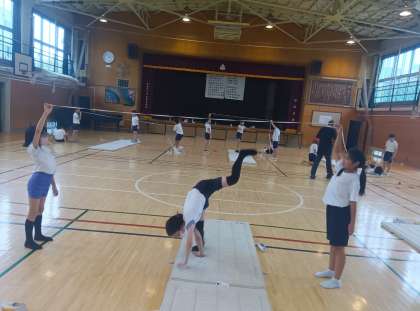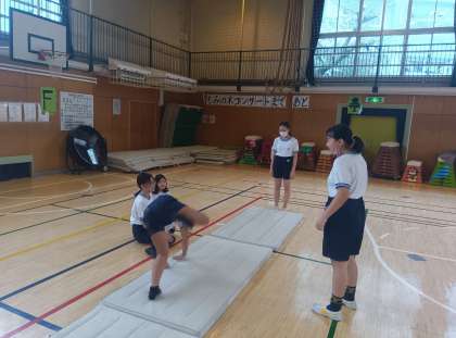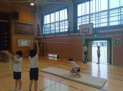 5年生の体育はマット運動を行っています。側方倒立回転を中心に取り組んでいました。脚(腰)を高く上げられるかどうかが、技の完成度に関わってきます。二人の友達にゴムを持って張ってもらいます。高さを指定し、そこに脚が掛かるように側方倒立回転をします。少しずつ指定する高さを上げていき、完成度を高めることに意欲的にチャレンジしました。