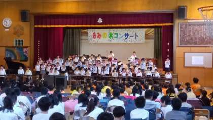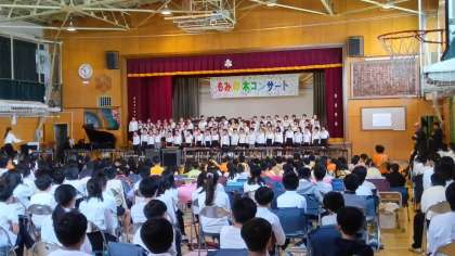 初めてのコンサート、堂々とやり遂げました。斉唱「あおいそらにえをかこう」合奏「アイアイ」斉唱「にじ」を披露しました。胸元のキラキラ光るリボンがとてもかわいらしく、1年生の舞台に華を添えていました。