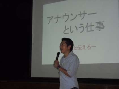 今回は、「アナウンサーという仕事−仲間と伝える−」というテーマで、本校保護者でもある、テレビ朝日アナウンサーの寺崎貴司さんに話していただきました。寺崎さんがアナウンサーになりたいと思ったきっかけや、一見華やかに見える番組の裏側で、多くの人々が力を合わせて制作にあたっていることを知ることが出来ました。