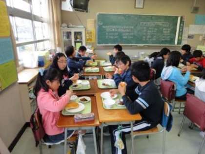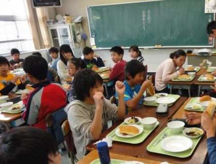 開校当時の給食を味わいました。メニューは、コッペパン、ジャム、脱脂粉乳、クジラの竜田揚げ、キャベツソティーです。クジラは今は高級品です。脱脂粉乳は苦手なようで残ったクラスが多かったようです。10日の式典に向けさまざまな方法で子どもたちに60周年をお祝いする意識づけを行っています。