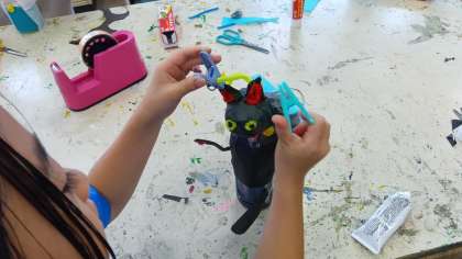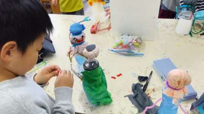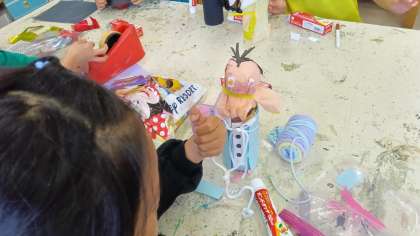 2年生の図工ではペットボトルや身の回りの物を使って「ピコリン星人」を作っていました。モール、色画用紙、テープ類など、様々な材料を駆使して、自分がイメージしたピコリン星人を創り上げていました。ピコリン星人を飾るステージ作りもこの先取り組んでいきます。すでにステージ作りを始めている子もいて、自分のピコリン星人の世界観に合った飾り付けを考えていました。