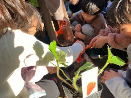 2年生は生活科の学習で、これからいちごを育てます。今日は苗を鉢に移し替えました。栽培活動のスタートです。みんないちごを育てるのがうれしそうです。どのようにお世話をしたら、いちごがよりよく育ち、甘い実をつけるのか自分たちでも調べるなどして頑張って育てていきます。