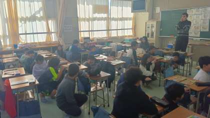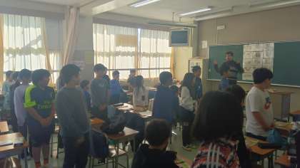 4年生の外国語活動では、ゲームを通して体を動かしながら英語に親しみました。まっすぐ進む、しゃがむ、向きを変えるという動作の英語をALTが発話して、指示をします。しかし、動作指示の前にあるフレーズを言った時しか動いてはいけません。ALTのスピーキングに意識を集中させながら楽しく活動しました。