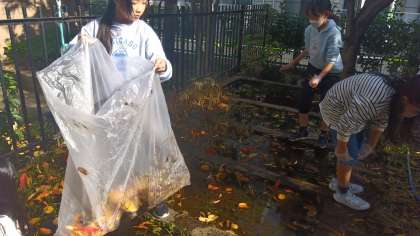 4年2組がビオトープで環境整備を行っていました。池には大分落ち葉が溜まってしまっていました。それらをきれいに取り除き、太陽光がしっかりと池の中まで届くように整備しました。池の中の生き物だけでなく、地上の生き物も過ごしやすくなるよう土をほぐすなど、自分たちで考えながら活動していました。