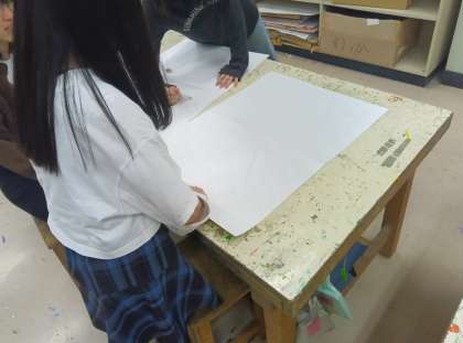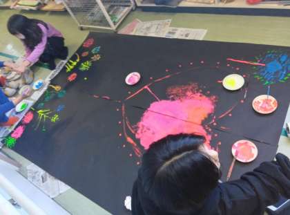 6年生の図工ではブラックライトアートに取り組んでいます。テーマは、花火、祭りです。まだ計画段階のグループがありますが、テーマに沿ってイメージはどんどん浮かんでいるようです。グループで話し合いながらそれぞれが一生懸命取り組んでいます。完成とブラックライトの点灯で映える作品の鑑賞が楽しみです。