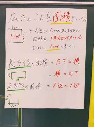 4年生の算数は面積の学習が進んでいます。今日は「周りの長さが24cmの長方形で、縦の長さが何cmの時に面積が最大になるか」を考えました。「周りの長さが同じなのに面積に違いはあるの?」「縦が1cmの時、横が何で11cmになるの?」などと言った疑問を、これまで習ってきたことを基に解決していきました。縦の長さ、横の長さ、面積の数値をそれぞれ表に整理し、その後、折れ線グラフを作って縦の長さによる面積の変化を分かりやすくしました。これまで学んだことを生かして問題を解いたり、表現したりする場面がたくさんあり、その大切がよく分かる授業でした。