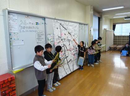 2年生がまち探検で調べてきたことを友達やお家の方、協力してくれた地域の方の前で発表をしました。探検に行かなければ分からなかったこと、気付けなかったことがたくさん報告されました。もっと詳しく知りたい、また行ってみたいと願いを膨らませている子がたくさんいました。これからも地域に住む一員として、よりよく地域と関わって、もっともっとこの地域を好きな気持ちが大きくなるよう、学習を重ねていきます。