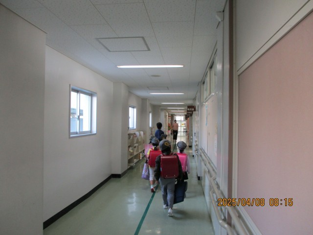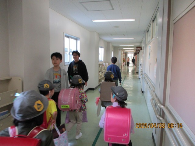 入学1日目、新1年生も元気に登校しました。玄関で、6年生のお兄さん、お姉さんに迎えられ、教室に向かいます。