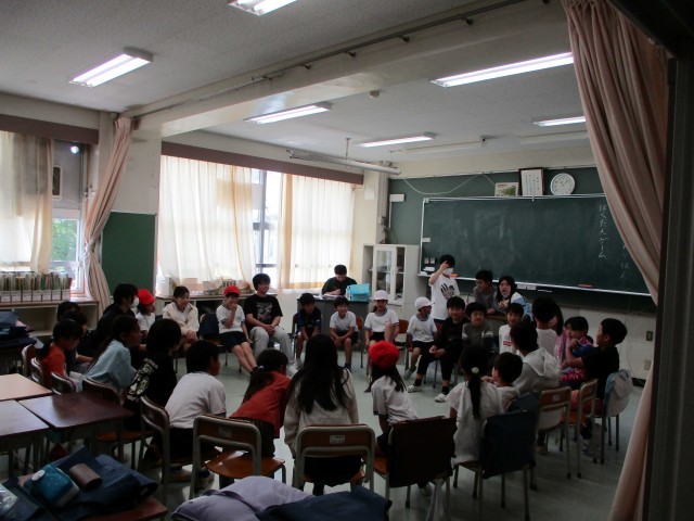 3時間目は第2回縦割り班活動でした。各班ごとにゲームをして楽しみました。6年生の進行によってゲームを進めます。「なんでもバスケット」や、曲のかかっている間にボールをまわす「ばくだんゲームなど」をして交流を深めました。最後は、机や椅子をみんなで戻し、6年生は1年生を教室に送り届けて今日の活動をおえました。