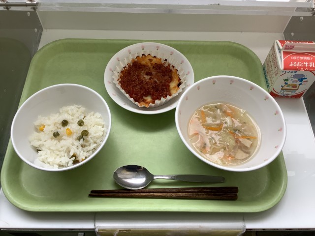 ◎「グリンピースごはん」のグリンピースは、さやむきしたものと、有機米(今年度から月1回出しています)、もち米、コーンを一緒に炊きました。栄養いっぱいのグリンピースは、青エンドウ、実エンドウともいいます。