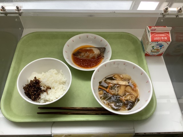 「魚のステーキソース」今日はぶりに下味をつけて焼き、給食室特製ソースをかけて仕上げました。