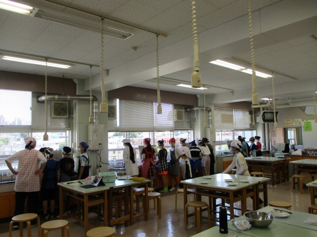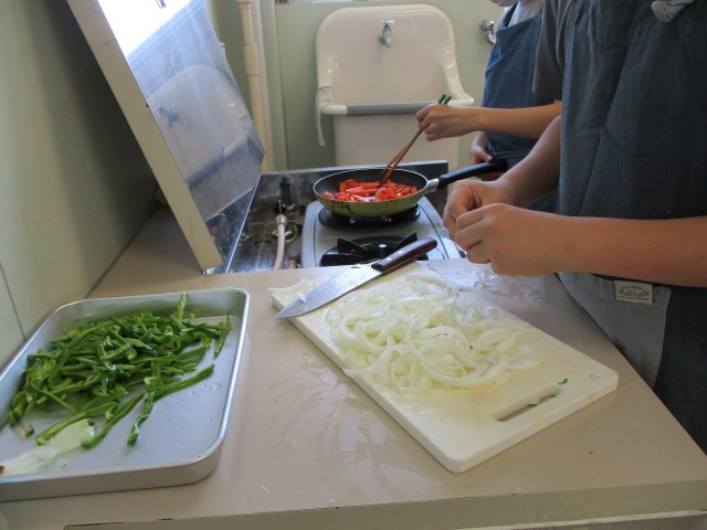 家庭科室からは、美味しそうな良いかおりがしてきました。本日、6年生は調理実習で、”いためる”をテーマに、