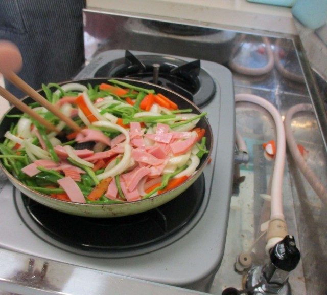 にんじん、ピーマン、たまねぎを切って、ハムを加え、「いろどりいため」に挑戦していました。