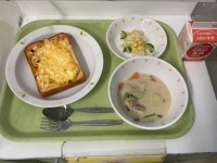 今日の献立・たまごトースト・牛乳・タラの豆乳シチュー・コーンサラダ
