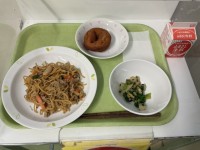 今日の献立・塩焼きそば・牛乳・野菜の中華かけ・黒糖きなこドーナツ◎「黒糖きなこド...