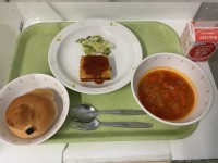 今日の献立・ぶどうパン・牛乳・スペイン風オムレツ・グリーンサラダ・豆入りミネスト...
