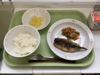 【今日の献立】・ごはん・牛乳・魚のかば焼き風・野菜のごま酢あえ・くだもの(りんご...