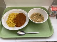 【今日の献立】・米粉キーマカレーライス・牛乳・卵とコーンのスープ