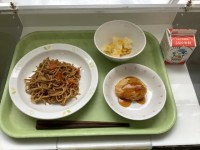 【今日の献立】・ソース焼きそば・牛乳・おから入りサクサクつくね・コーンポテト