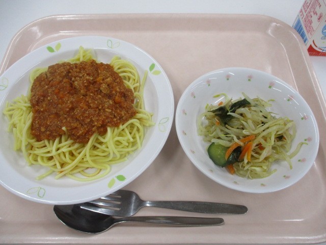 スパゲティミートソース・もやしとじゃこのサラダ・牛乳
