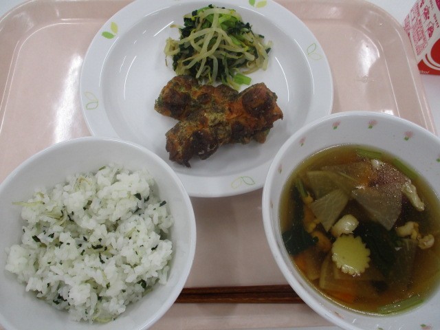 わかめとじゃこのごはん・ちくわの2色あげ・菊のおひたし・五目汁・牛乳