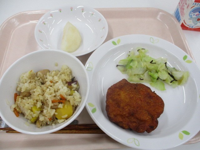 秋の香りごはん・手作りさつまあげ・きゃべつのしおこんぶかけ・梨・牛乳