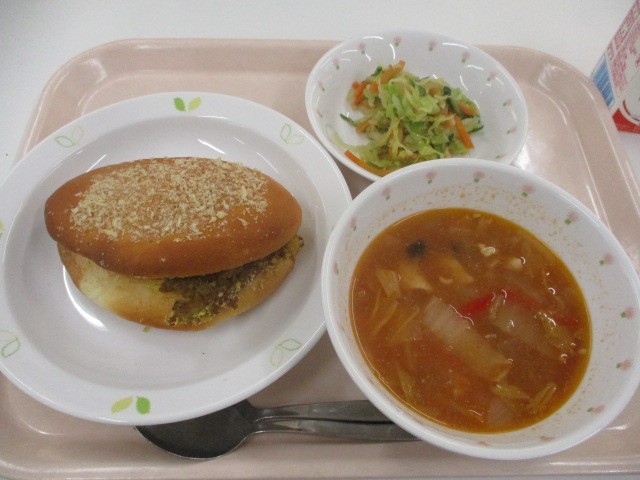 焼きカレーパン・野菜サラダ・まめまめスープ・牛乳