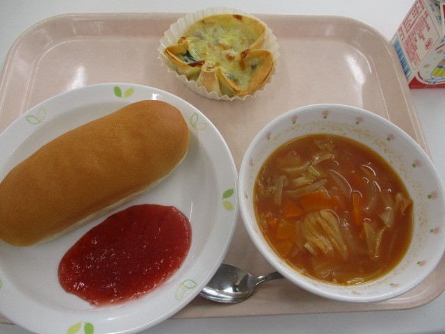 パン・おばあちゃんのキッシュ風・赤いトマトスープ・手作りいちごジャム・牛乳