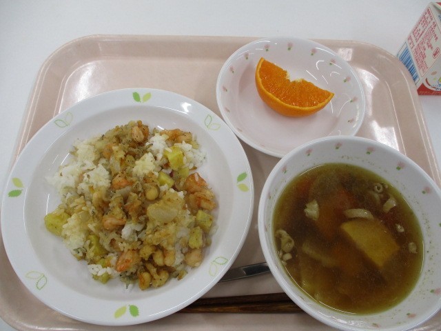 エビと大豆のバラ天丼・けんちん汁・せとか・牛乳