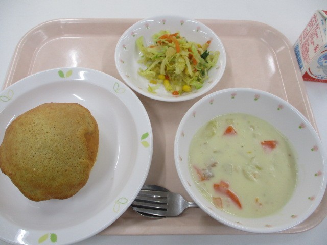 ビスキュイパン・サーモンシチュー・野菜サラダ・牛乳