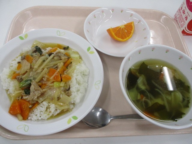 中華あんかけごはん・わかめスープ・カラーマンダリン・牛乳