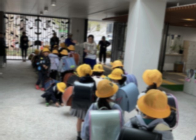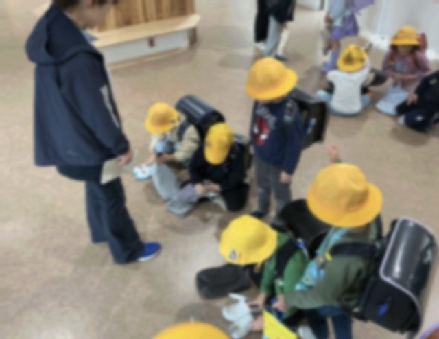 1年生の下校の様子。初めての終末を迎え、持ち帰りものを整えて下校準備です。上履き袋に上履きを入れる作業もまだぎこちない様子です。でも、経験を積むとすぐに慣れていくと思います。