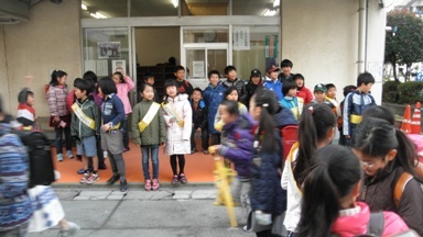 募金活動をしている代表委員がどうしても目立ちますが、あいさつ運動担当の4年1組と2年1組も負けてはいません。たくさんの子どもたちが声を出し、あいさつを呼びかけていました。